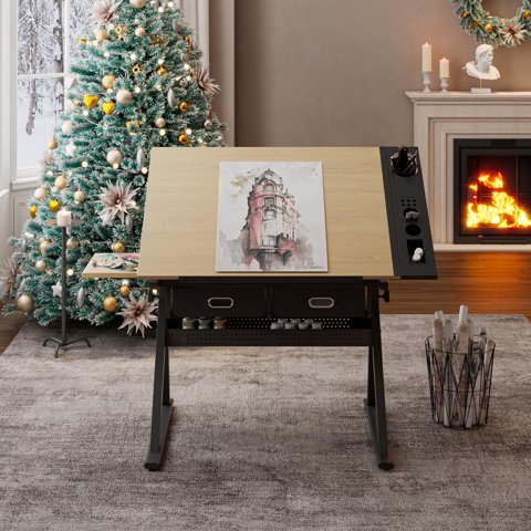 M&Ms - Adjustable Drawing Drafting Table Desk With 2 Drawers For Home Office And School With Stool(Maple) | Lider Electrohogar