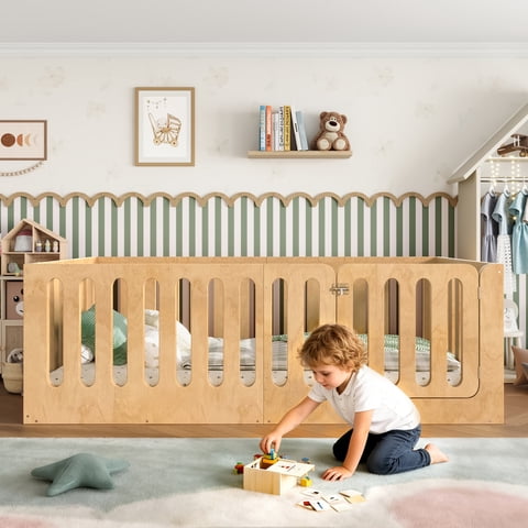 M&Ms - Twin Size Floor Bed With High Fence For Kids, Solid Wood Kids Montessori Bed With Door, Low-Profile And No Box Spring Needed Design, Natural.(Patent Protection) | Lider Electrohogar