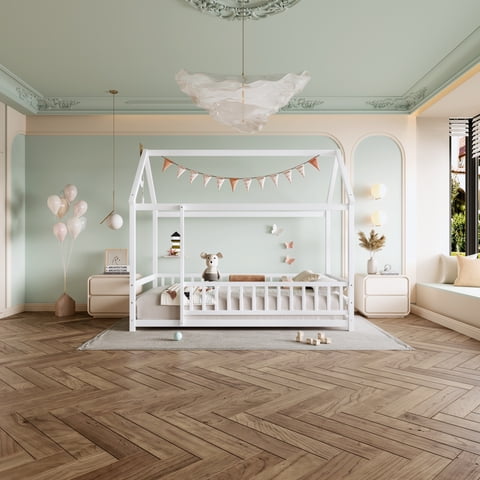 M&Ms - Twin Size Floor Wooden Bed With House Roof Frame, Fence Guardrails,White | Lider Electrohogar