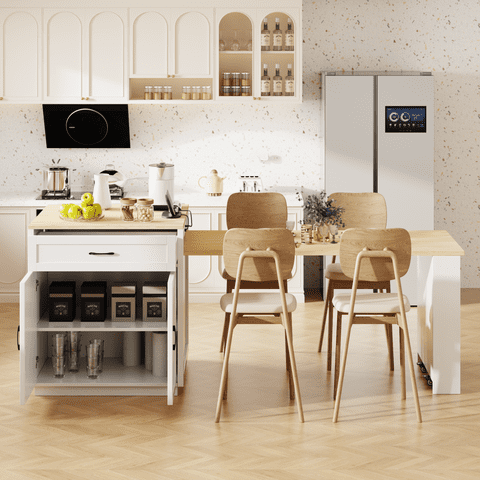 M&Ms - K&K 82.7 Inch Kitchen Island With Extendable Dining Table For 4-6 Person,Two-Tone Kitchen Table With Double-Sized Storage, Power Outlet, Kitchen Island With Storage 2 Drawers 2 Side Open Shelves,White | Lider Electrohogar