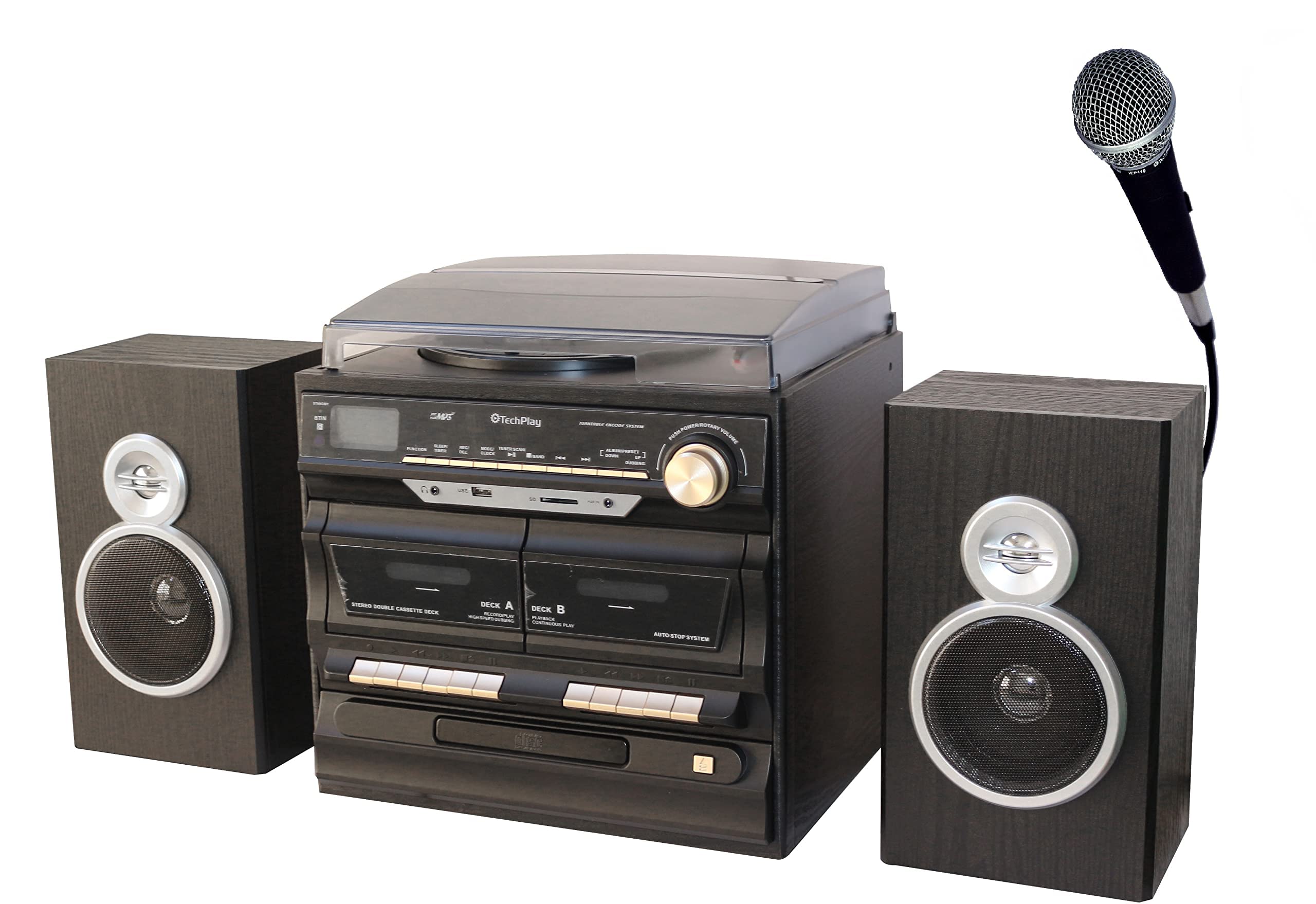 Esta unidad está cargada con todas las características que quieras o necesitas. tocadiscos de 3 velocidades para reproducir todo tu vinilo con palanca de elevación, selector de parada automático/manual. grabadora/reproductor de cd doble y casete, para disfrutar de tu colección de cd o cassette, o grabar en tu propio cd o casete desde tocadiscos, radio, aux, cd, usb, casete o cd. bluetooth con función nfc que te permite conectarte de forma inalámbrica a tu teléfono inteligente. sd, usb para reproducir o grabar en formato mp3. entrada aux y conector para auriculares todo delante de la unidad para un fácil acceso. radio digital am/fm con escaneo automático y preestablecidos. mando a distancia, pantalla lcd. incluye micrófono profesional. para tu placer de karaoke, cubierta antipolvo y adaptador de 45 rpm. el adaptador de ca suministrado es de 100 a 240 v para uso mundial. - máquina de karaoke con tomas de micrófono de remolque, control de volumen y eco. incluye un micrófono profesional techplay. - tecnología bluetooth nfc easy connect para una conexión fácil y rápida tecnología para una conexión fácil y rápida - doble reproductor de cassette/grabadora (reproducción, pausa, avance rápido, rebobinado, grabación y parada) - tocadiscos de 3 velocidades con palanca elevadora, reproductor programable de cd/mp3. - grabación directa usb/sd desde tocadiscos, cassette, cd, entrada auxiliar, radio fm