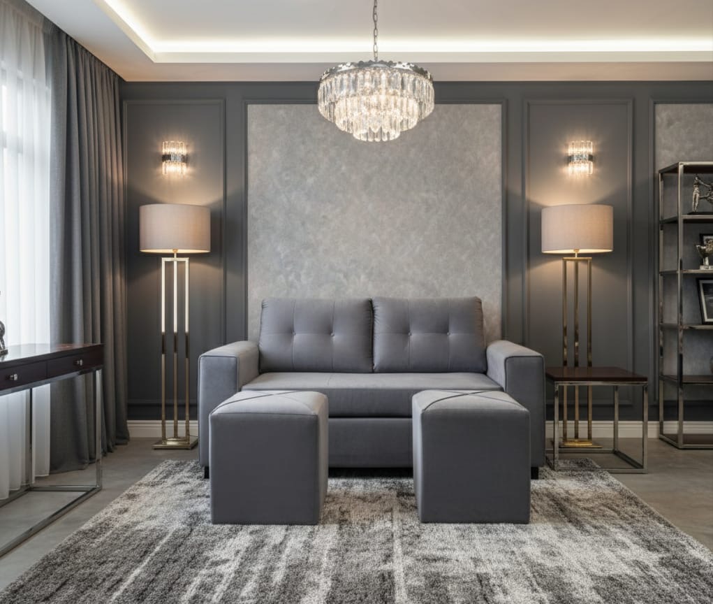Focus - Sofá Venecia + 2 Puff Felpa Gris