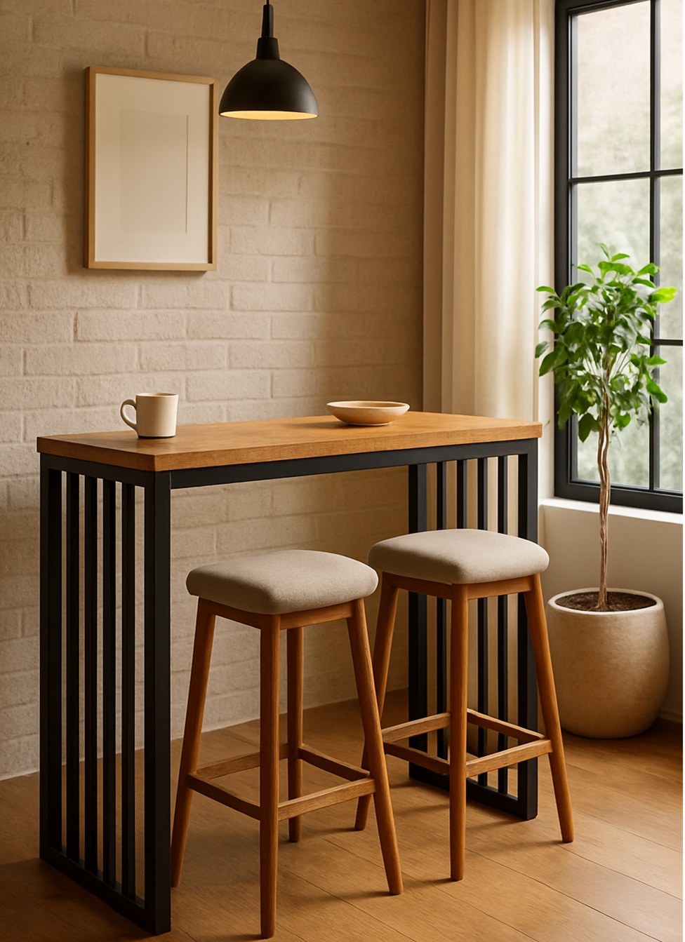 Mesa bar de diseño moderno en metal y madera, ideal para ambientes sociales y espacios reducidos con estilo.