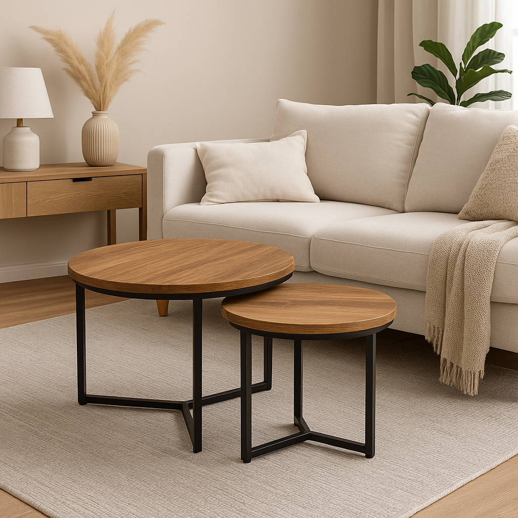 Set de mesas nido con diseño industrial. ideales para complementar tu living con estilo y funcionalidad. estructura metálica y cubiertas de madera que aportan calidez y carácter al ambiente.