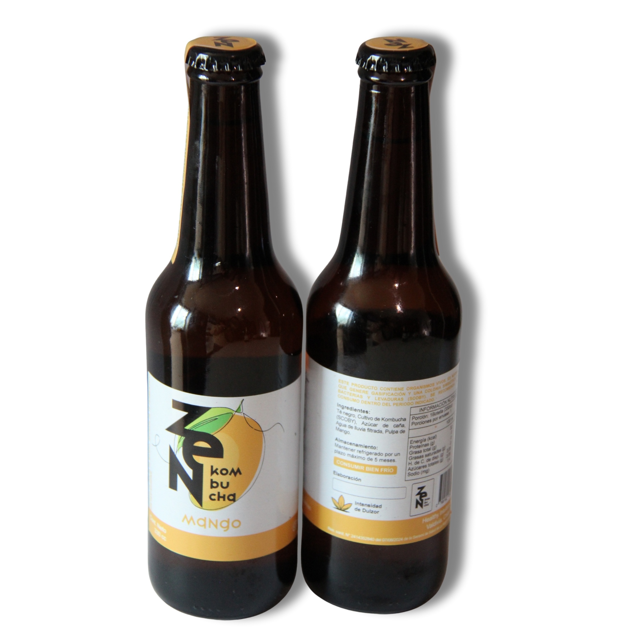 Ingredientes: te negro, cultivo de kombucha (scoby), azucar de caña, agua filtrada, pulpa de mango