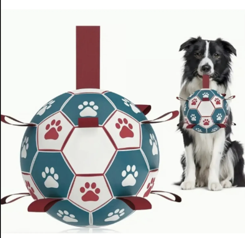 la pelota de fútbol de juguete para perros está diseñada con bloques de color y correas de nailon que le dan un aspecto llamativo y atractivo para tu perro. las correas de nailon también hacen que sea más fácil para ti lanzar la pelota y para tu perro agarrarla y llevarla de un lado a otro.