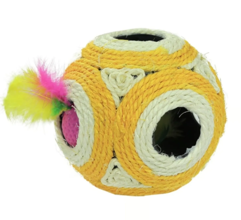 Una pelota de sisal con sonajero en color amarillo es un juguete ideal para mantener entretenido a tu gato. el sisal es un material resistente que es perfecto para que los gatos lo arañen y jueguen. el sonajero dentro de la pelota añade un elemento auditivo que puede captar la atención de tu gato y hacer que el juego sea aún más divertido. el color amarillo brillante también puede ser atractivo para tu gato y estimular su curiosidad. este tipo de juguete es ideal para promover el ejercicio y la actividad física en tu gato, al tiempo que le proporciona horas de diversión.