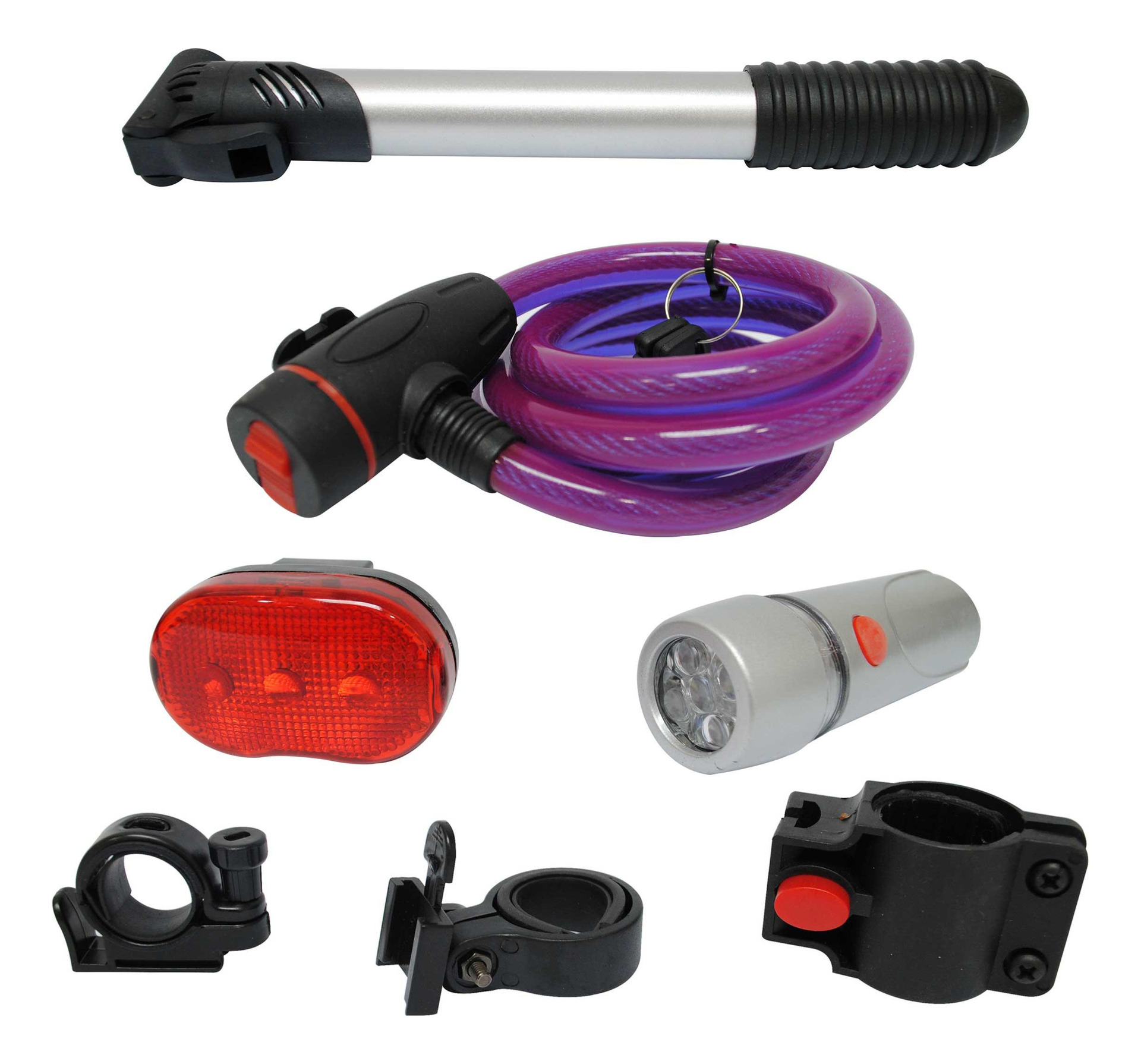 Este set es perfecto para terminar de complementar los accesorios que le faltan a la bicicleta. cuenta con una luz delantera ideal para utilizar durante la noche, una luz trasera para hacerse visible al momento de andar en las calles y protegerse de autos y otros ciclistas, un candado para cuidar la bicicleta de robos, y un bombín que puede servir de emergencia en caso de que se desinflen los neumáticos. el set de seguridad 4 en 1 de vision está pensado para resguardar al máximo tu seguridad como la de tu bicicleta. * contiene: candado con llave, luz delantera, luz trasera, bombín de mano * candado espiral con llave * de fácil uso y portable. * bombín de aluminio con mango.