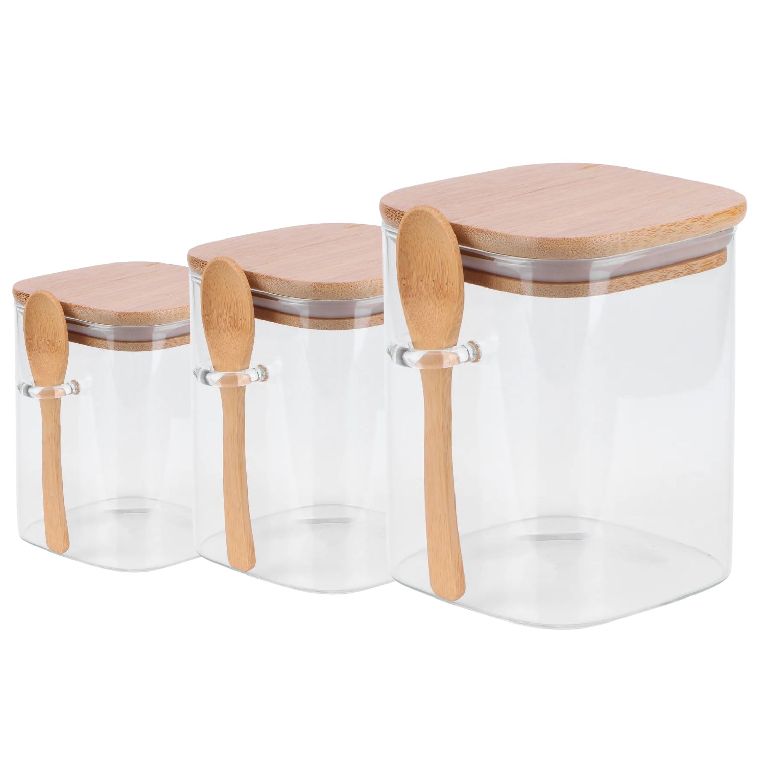 Set 3 frascos tarros cuadrado vidrio con cuchara bambú. perfectos para organizar tu cocina con estilo. ¡compra ahora y transforma tu espacio!