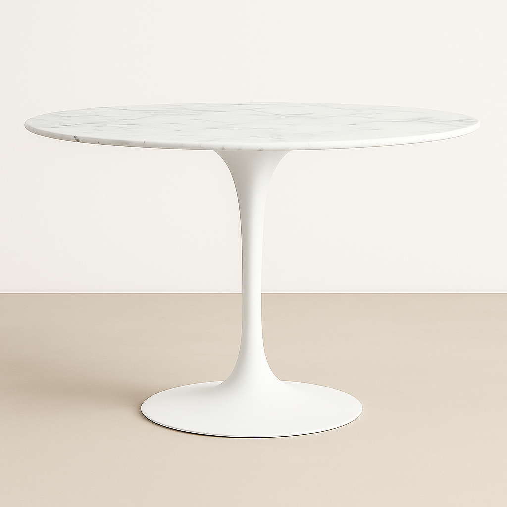 Mesa tulip redonda de cuarzo calacatta soft base blanco 80cm