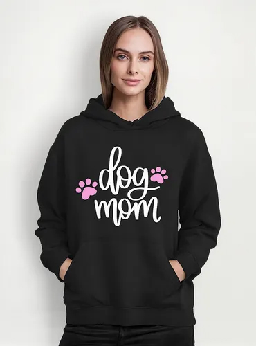 Polerón dog mom mama perruna estilo urbano, tipo canguro con capucha y bolsillos. confeccionado en tela de alta calidad con estampado en vinil textil resistente. ideal para los amantes de los perritos dog lovers y la moda streetwear.