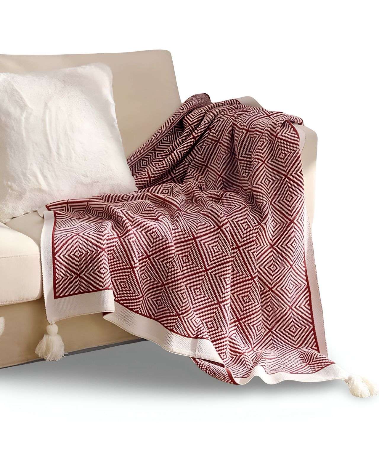 Mantas para sofas camas u oficinas con pompon 130x150 cm burdeo