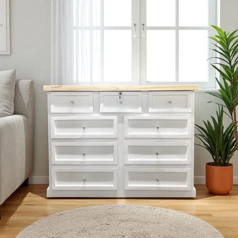 Arca Muebles - Comoda De Madera 9 Cajones 120X40X90 Color Blanco Cubierta Natural | Lider Electrohogar