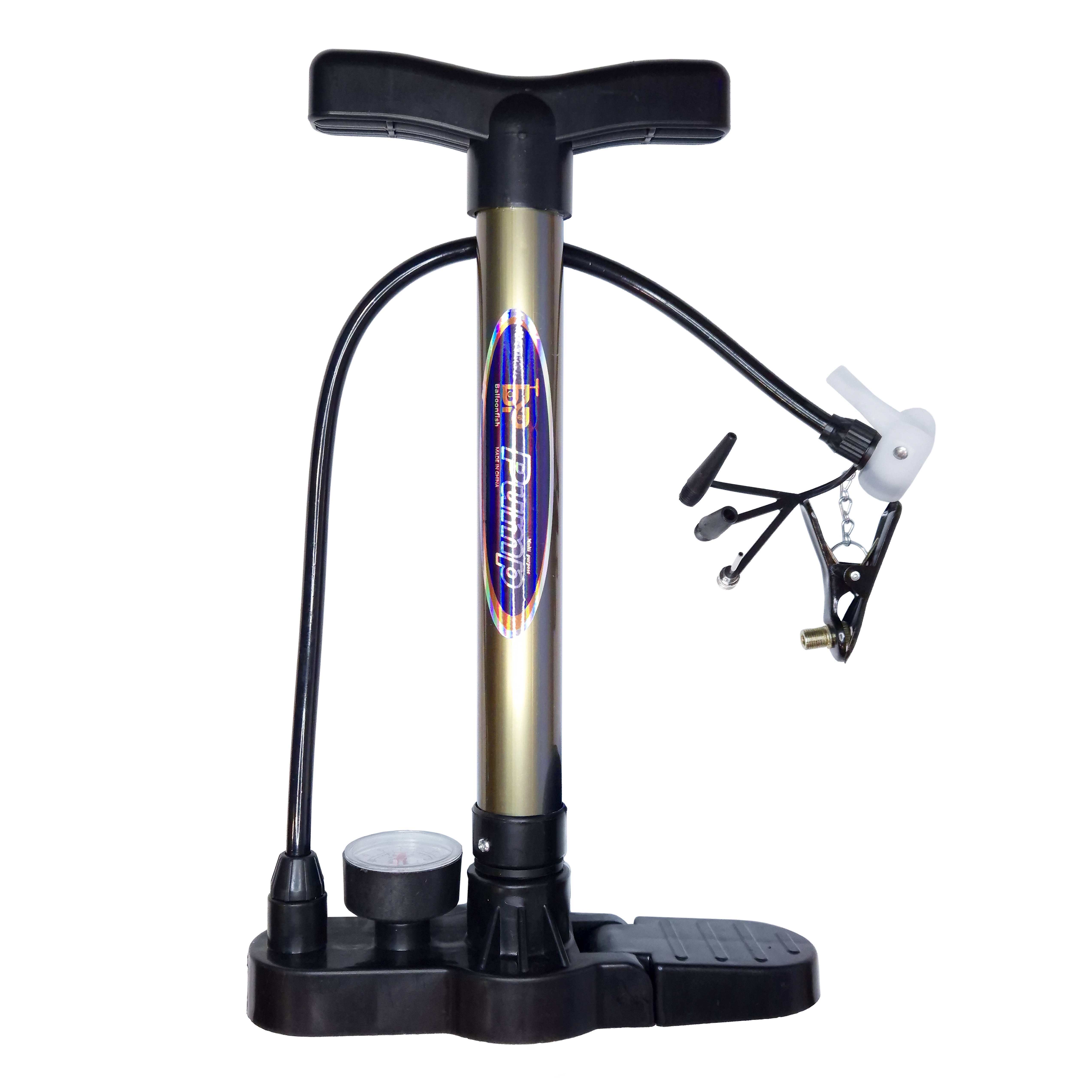 Bomba de aire manual, con manómetro en la base: máx. 10 bar, mango ergonómico y 3 boquillas.