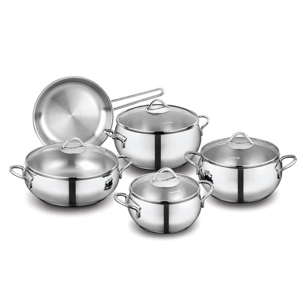 Batería de cocina korkmaz tombik de 9 piezas en acero inoxidable 18/10, con base de supercápsula, apta para inducción, gas y eléctrica, y lavavajillas.