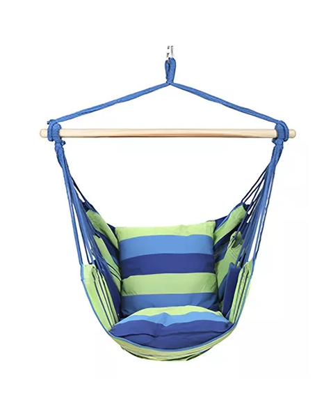 Columpio colgante azul y verde con dos almohadas para jardín