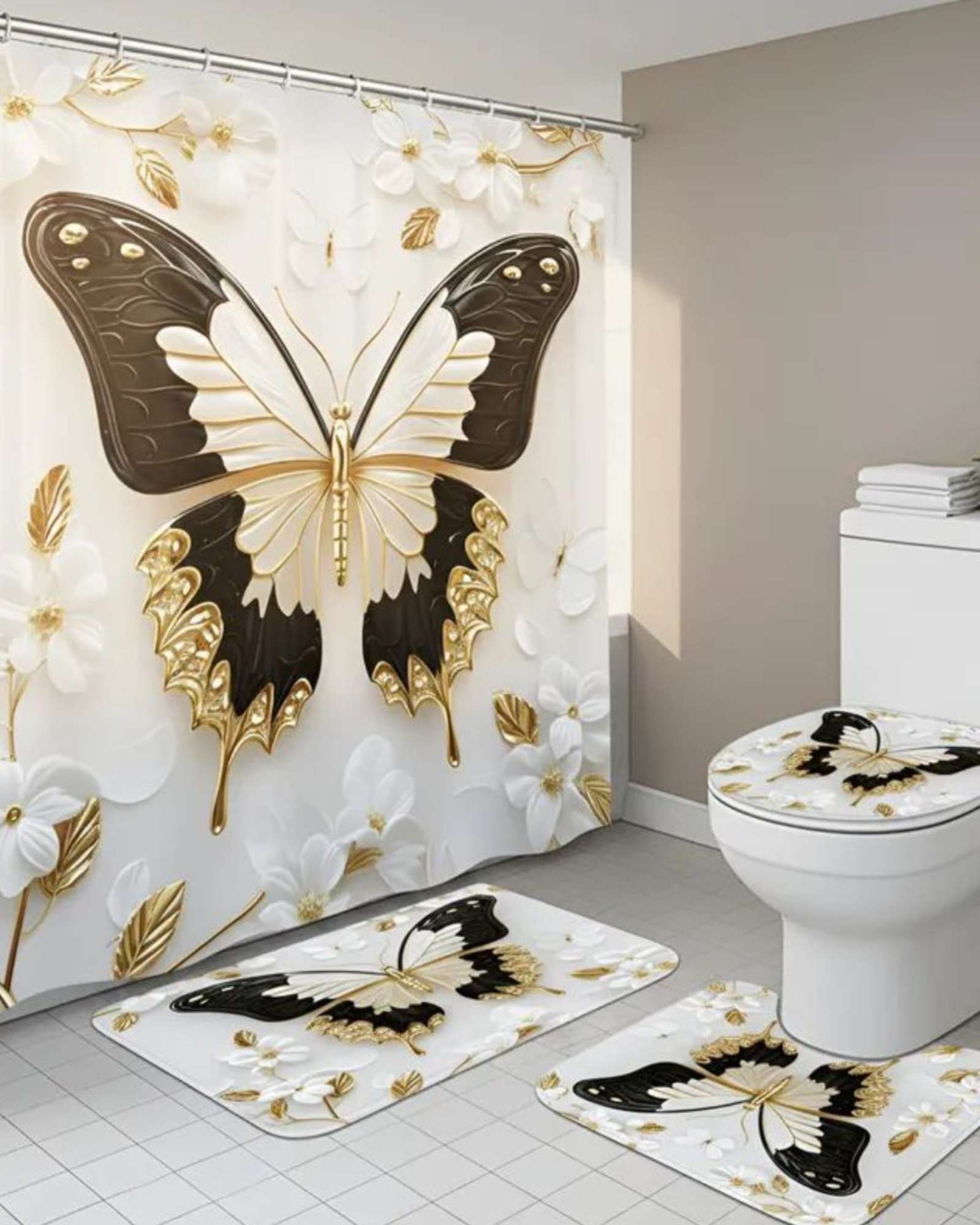 Juego 5 piezas con cortina de baño de tela poliéster y forro de ducha de plástico