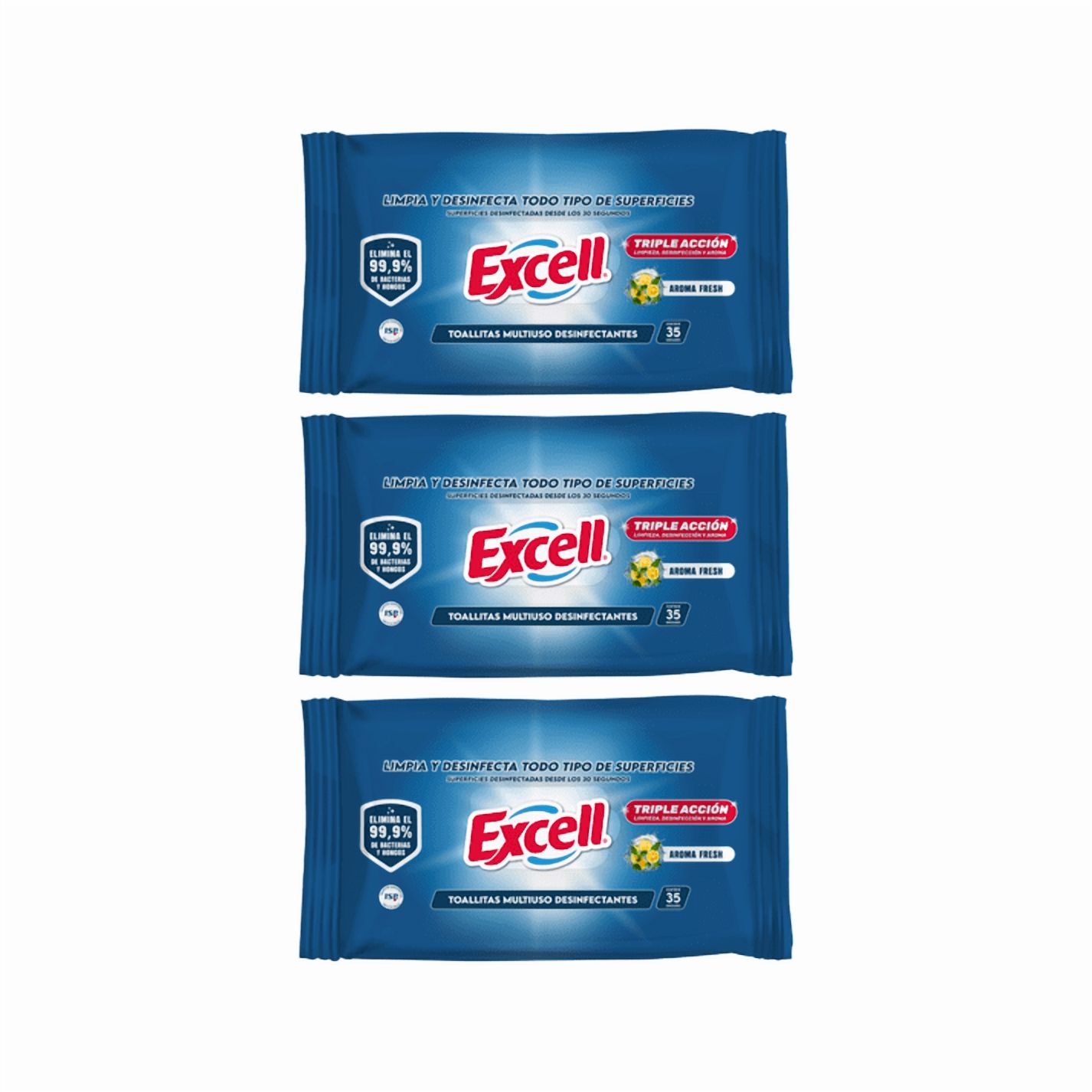 Pack 3 toallas desinfectantes excell de 35 unidades cada una, elimina el 99,9% de bacterias, limpia y desinfecta en un solo paso, ideal para el hogar, oficina o auto, con aroma fresco y formato práctico sin enjuague.