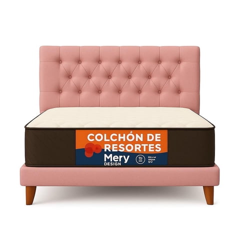 Cama Plaza y Media Rosado Capitone + Colchon Mery Desing