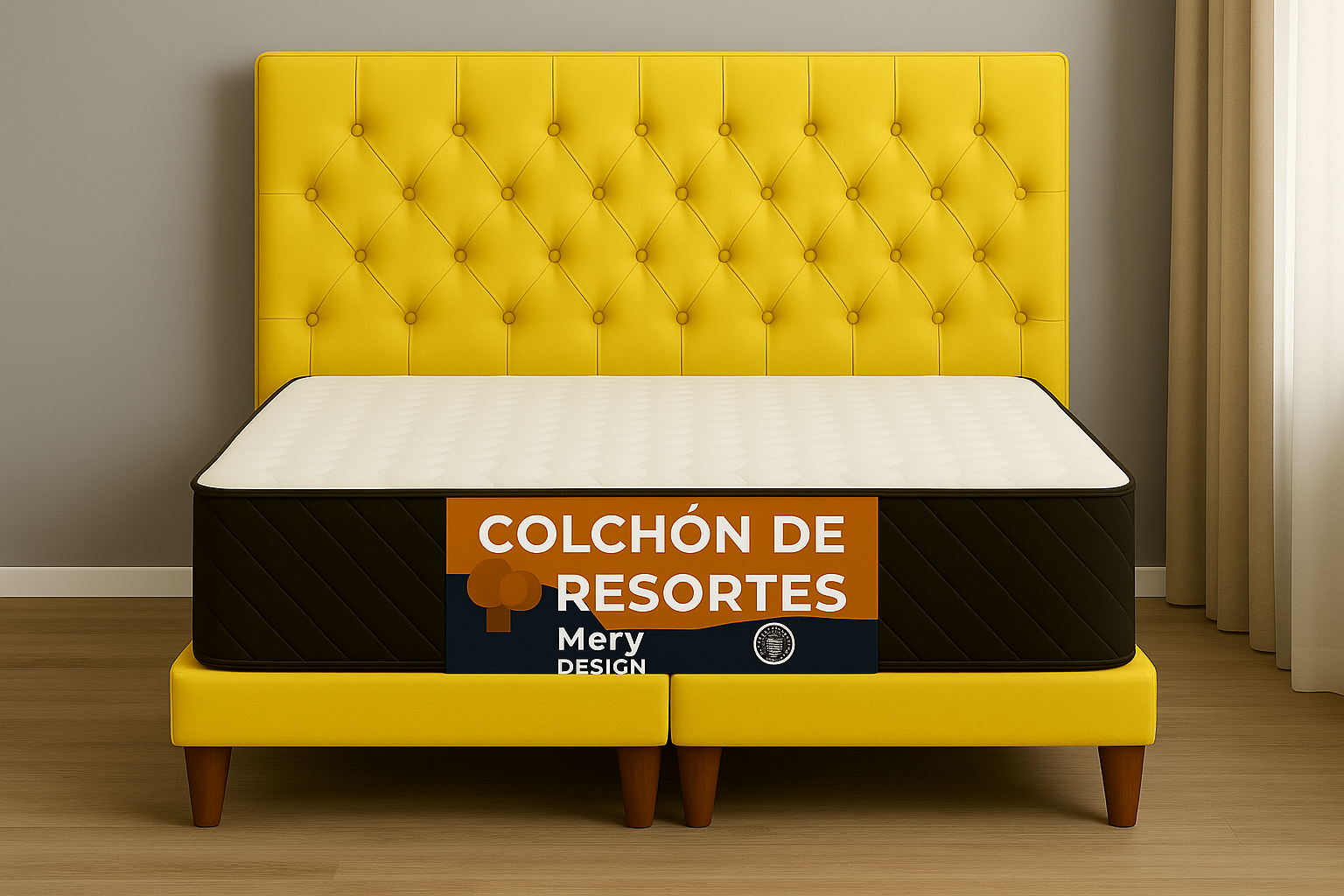 Ethan Desing - Cama 2 Plaza Capitoné + Respaldo 2P Capitone Amarillo + Colchón 2P Mery Desing | Lider Electrohogar