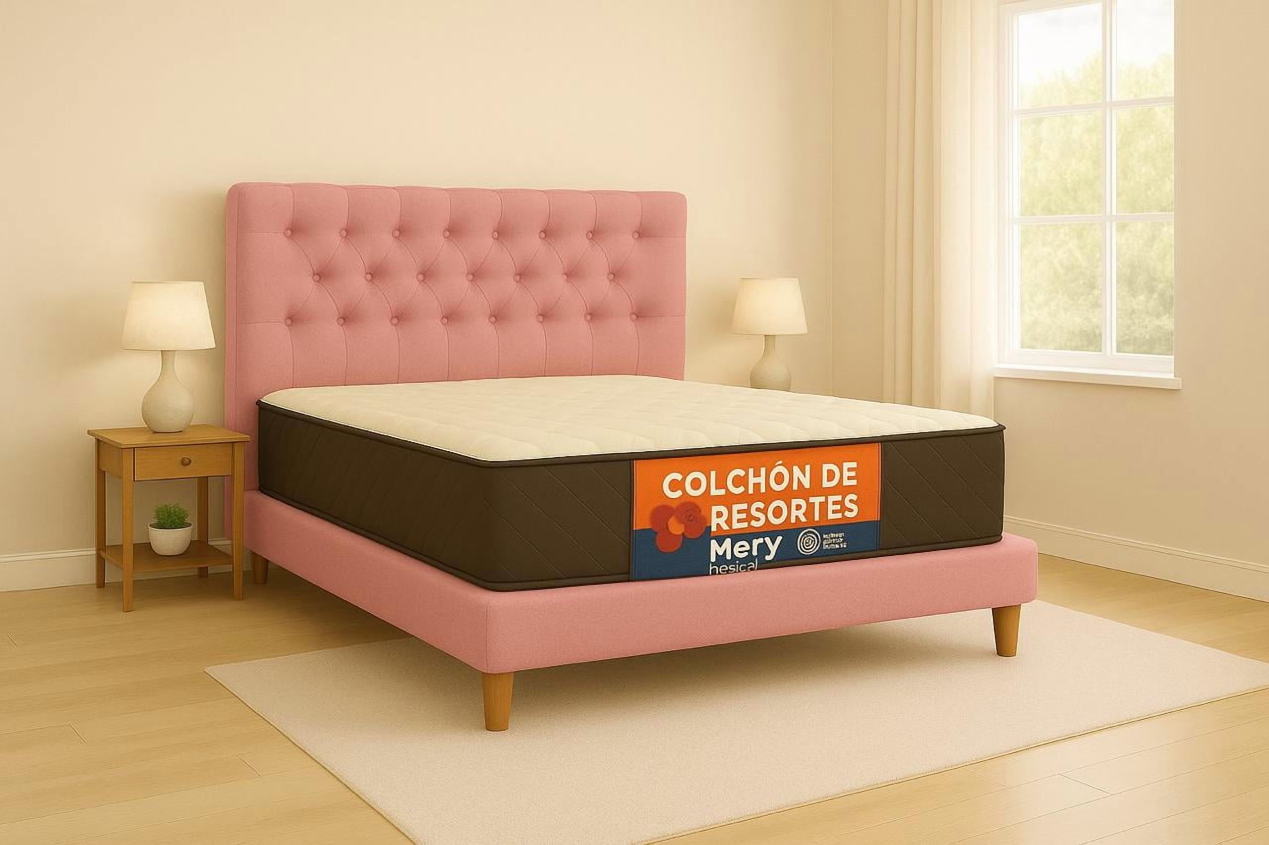 Ethan Desing - Cama Plaza Y Media Rosado Capitoné + Colchon Mery Desing
