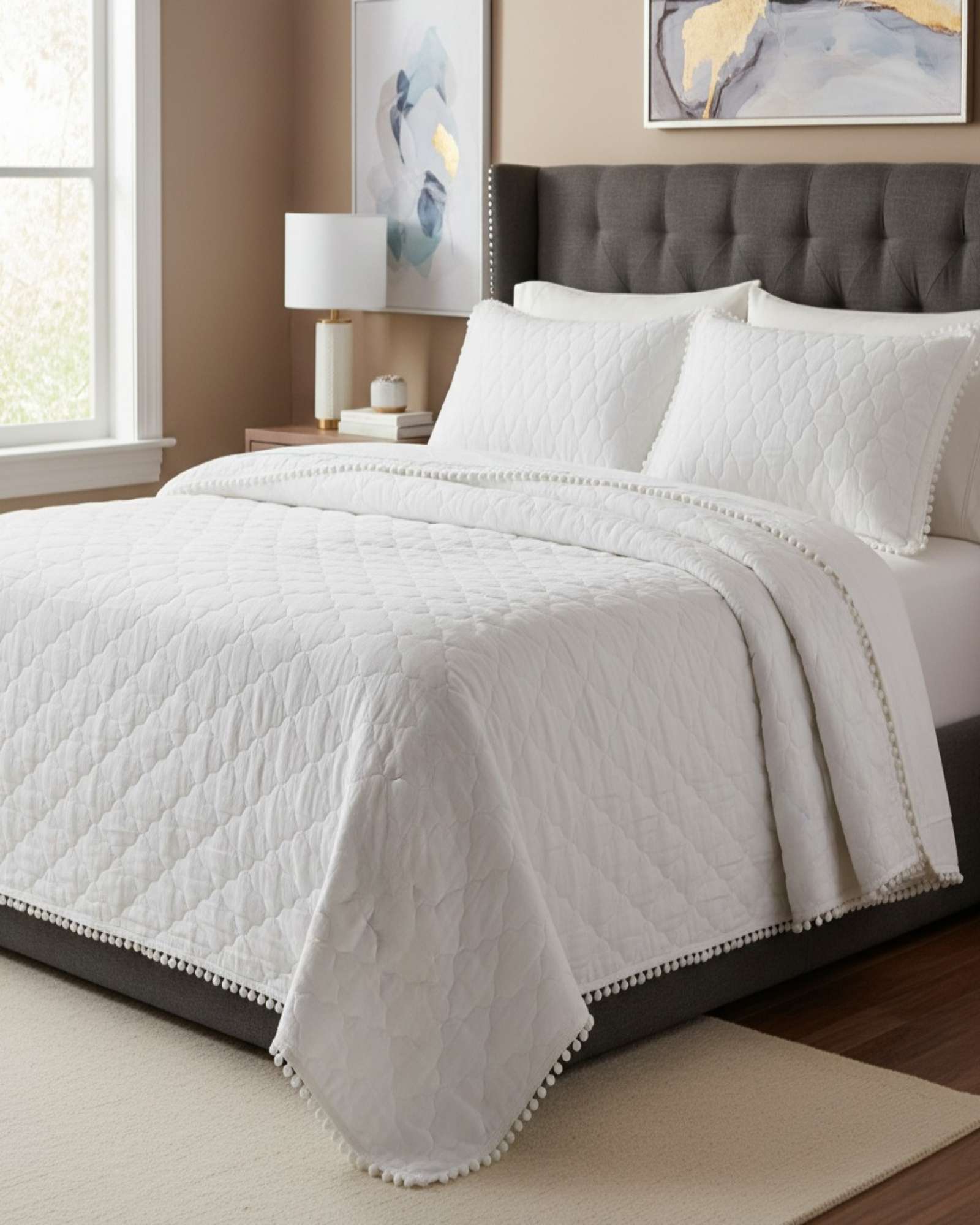 Imac Hogar - Quilt Premium Blanco Boho-Chic Con Pompones King-Superking