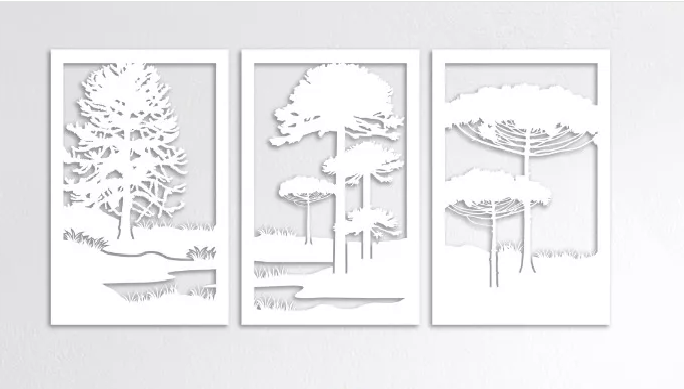 Set de 3 cuadros paisaje árboles araucarias blanco