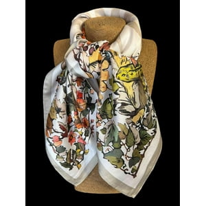 Pañuelo cuadrado, muy femenino, donde bellas y coloridas flores, en torno a la imagen de un sol de color beige, son protagonistas, en tonos principalmente de amarillo, rojo, café y más.materialidad: viscosamedidas: 90x90 cm.
