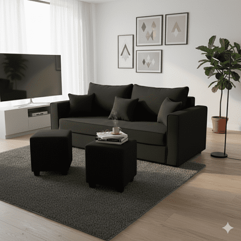 Construcsofá - Living Aurelia 2 Cuerpos + 2 Pouf Tela Negro