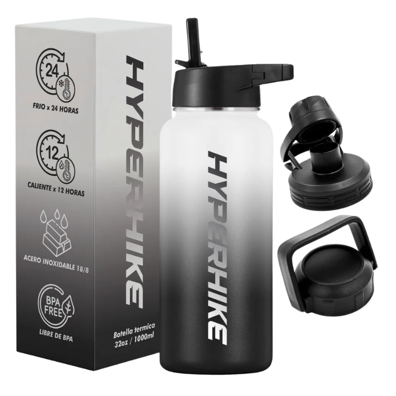 Termo Acero Inoxidable 1Lt Hyperhike Botella Térmica 3 Tapas Blanco / Negro | Lider Electrohogar