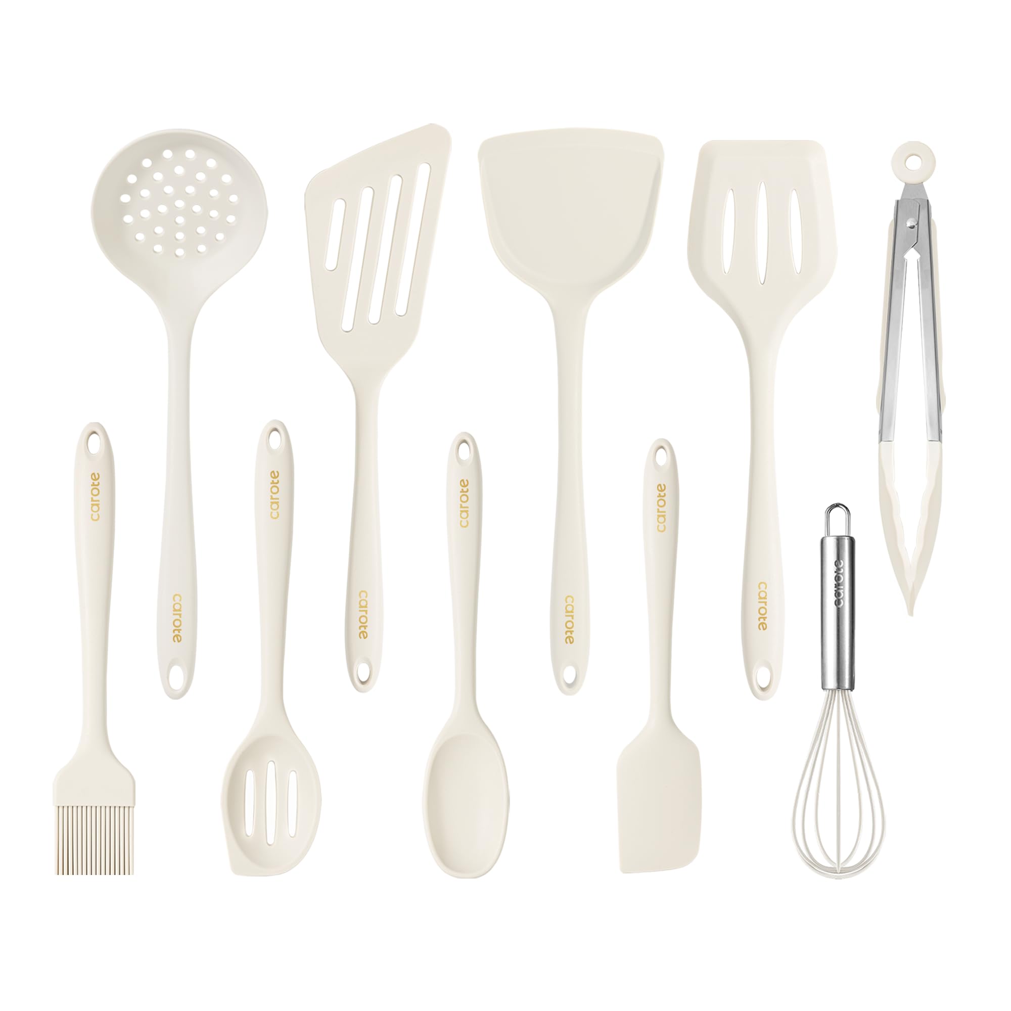 Carote juego de utensilios de cocina antiadherentes, juego de utensilios de cocina de silicona resistentes al calor, 10 piezas, color blanco, espátula sin olor, espátula para volteador - diseño saludable y cómodo: este juego de utensilios de cocina carote está hecho de silicona de grado alimenticio, lo que garantiza que no contiene bpa y sin olor. estos utensilios no impartirán olores no deseados a tu comida. el diseño de espátula más amplio hace que voltear huevos y revolver sea fácil y sin esfuerzo, lo que hace que sea imprescindible en cualquier cocina. - silicona premium resistente al calor: nuestro juego de utensilios de cocina de silicona resistente al calor no se derrite incluso a altas temperaturas. el fuerte núcleo interior proporciona durabilidad, asegurando que tus utensilios no se doblen ni se rompan. un excelente regalo para chefs o cocineros caseros - apto para utensilios de cocina antiadherentes: ¿cansado de rayar sus sartenes antiadherentes con utensilios de metal o plástico? este juego es la solución perfecta. la silicona suave y flexible no dañará tus utensilios de cocina, y los bordes flexibles te permiten entrar en cada esquina de tus ollas y sartenes con facilidad. - fácil de limpiar: nuestros juegos de utensilios cuentan con un diseño de silicona de una sola pieza, lo que los hace aptos para lavavajillas y fáciles de limpiar. siéntase libre de usar todas las herramientas y simplemente mételas en el lavavajillas para una limpieza sin complicaciones. el diseño sin costuras garantiza que ningún residuo de comida quede atrapado, y que no haya fugas de agua poco saludables de las costuras del mango. - juego de cocina esencial: este juego de utensilios de cocina de silicona de 10 piezas incluye todo lo que necesitas: volteador sólido, volteador ranurado, volteador de pescado, cuchara sólida, cuchara ranurada, cepillo para untar, espumadera, espátula, pinzas, batidor. es ideal para una variedad de tareas de cocina.