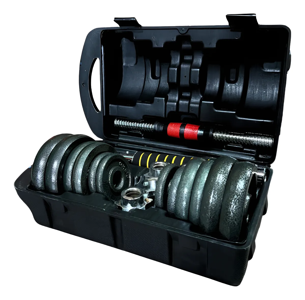 Set de mancuernas ajustables de 20 kg, ideal para entrenamientos de fuerza en casa. incluye discos de fierro sin revestimiento, barras cortas y barra extensora para mayor variedad de ejercicios. viene con maleta de transporte para un almacenamiento práctico y ordenado. perfecto para rutinas progresivas y completas.