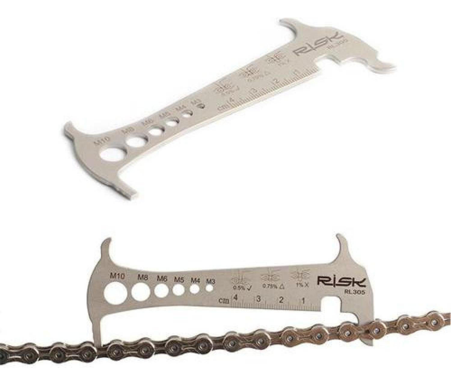Mide el estiramiento de tu cadena con esta herramienta precisa de la marca risk, cortada con láser y fabricada en acero inoxidable sólido y compacto. otras herramientas de menor calidad están construidas en una aleación metálica porosa, por lo que carecen de la precisión necesaria, induciendo a error. además miden solo estiramientos a partir de los 0,75%, que es el máximo estiramiento tolerable, y ya con probabilidades de daño. los estiramientos de cadena se miden en décimas de milímetros. grados de medida: a) 0,5%: inicio de la zona de precaución, se recomienda cambiar pronto la cadena. b) 0,75%: cambiar inmediatamente la cadena. evita este punto. tal vez ya hay daño. c) 1%: riesgo de corte inminente y daño piñones y platos para más información ver vídeo. otras características - construída en acero inoxidable sólido. - medidor de pernos (largo y diámetro) - funciona como sujetador a la hora de reemplazar eslabones **¿necesitas factura? una vez echa la compra envíanos un mensaje con los datos del receptor y te la haremos llegar a la brevedad.