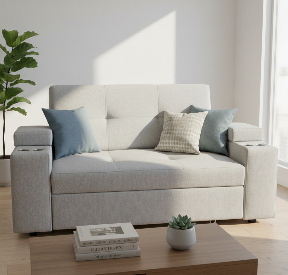 Sofá Cama Elite 2 Plazas Con Portavasos Y Baúl Lateral | Gris Claro | Camila Home | Lider Electrohogar