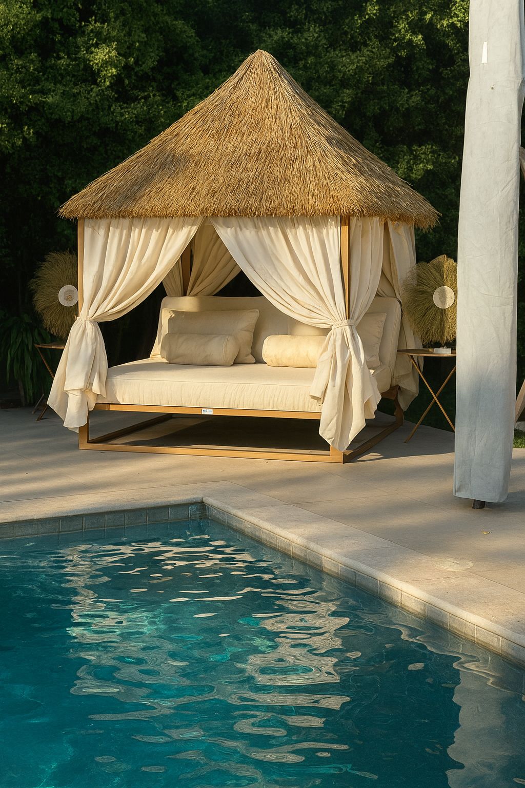 Cama balinesa metal reclinable. estructura metal fierro , pintura anticorrosiva. reclinación 3 posiciones. textil polylona impermeable, filtro uv, contra musgos. cortinas lona impermeable, filtro uv . colchonería