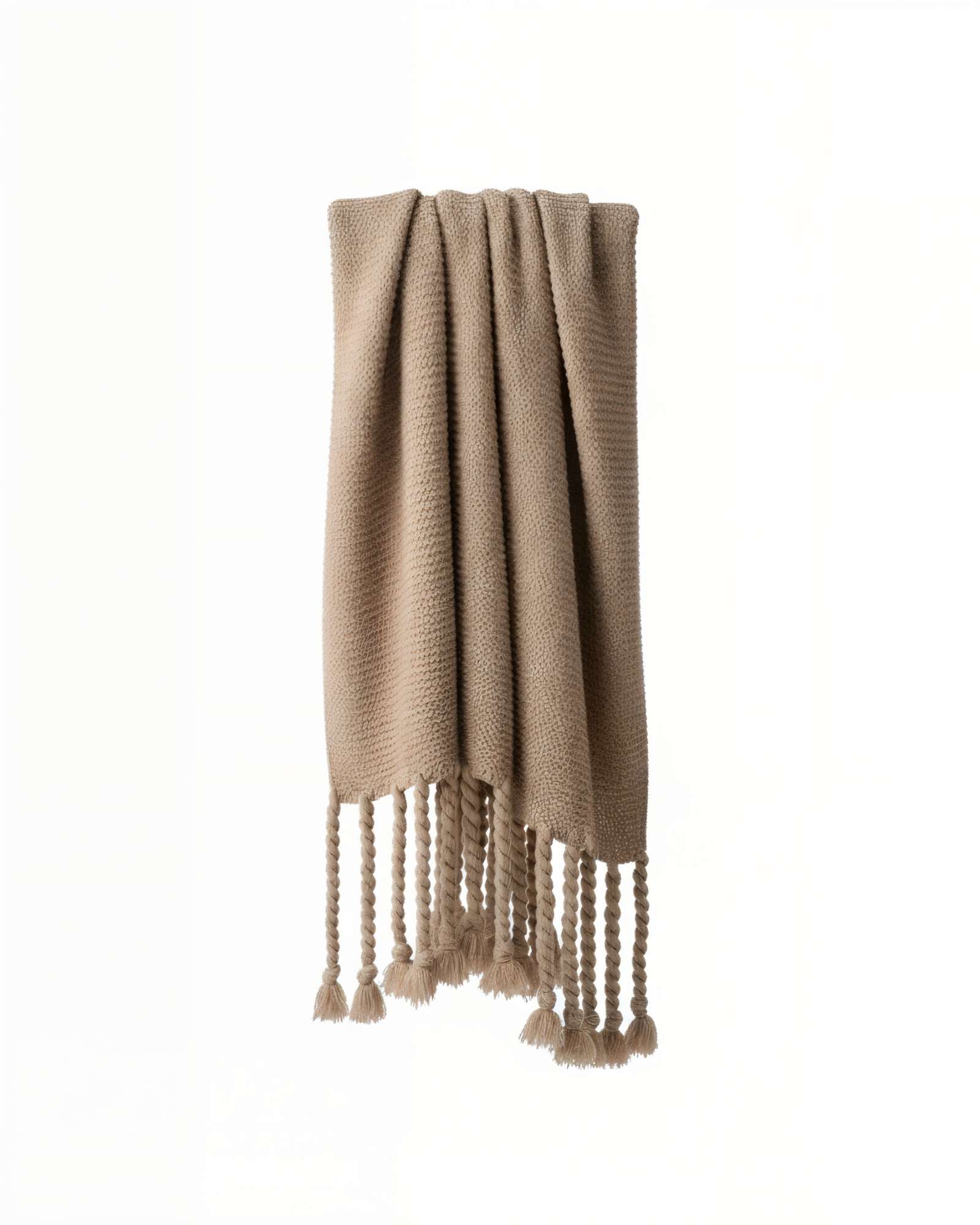 Manta chenille con flecos de soga trenzados color café claro