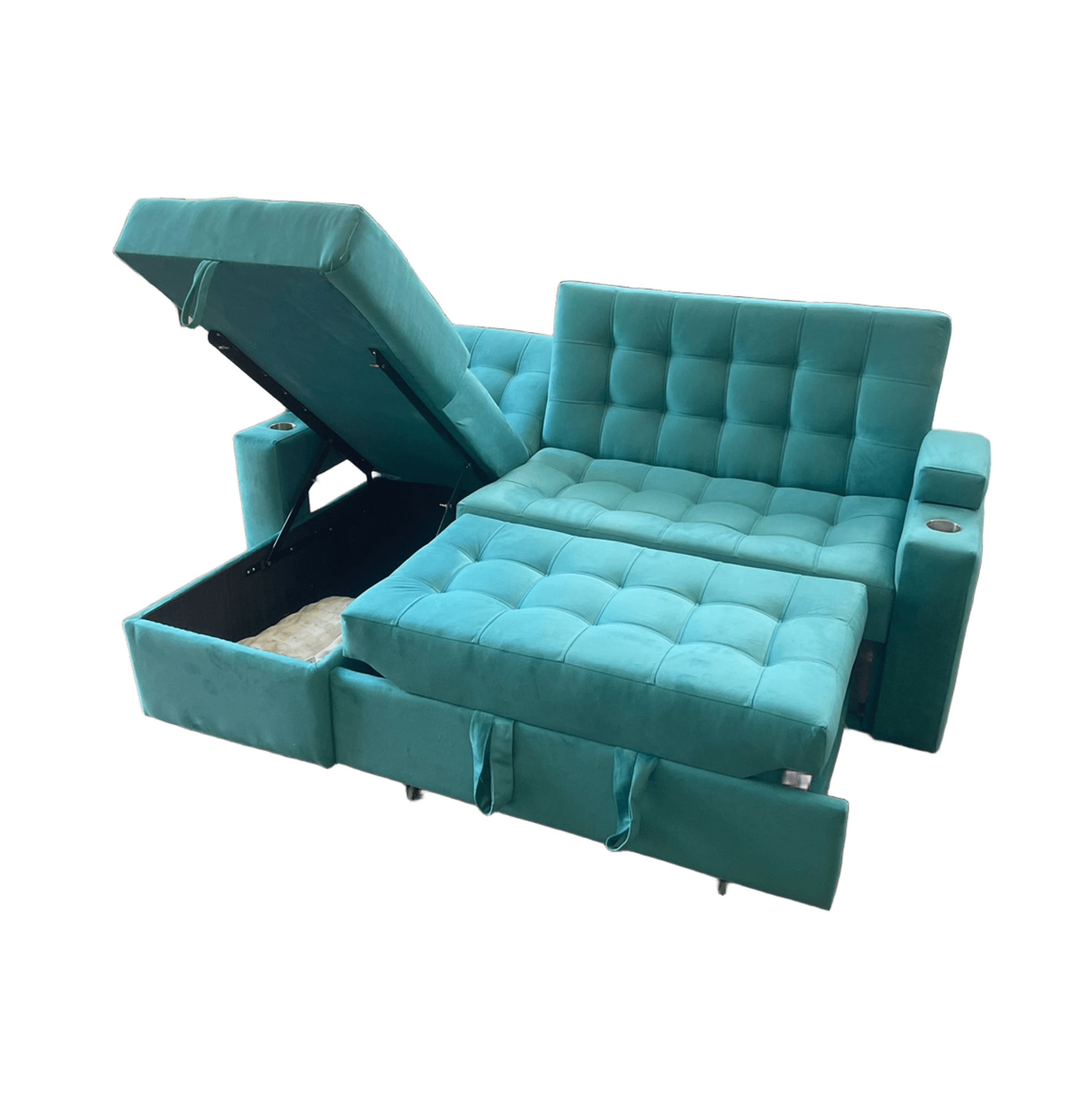 Sofá cama en l multifuncional de 3 plazas en felpa color turquesa. respaldo reclinable en 3 posiciones (sillón, relax y cama), baúl de almacenamiento, 2 puffs independientes y portavasos en ambos brazos. espuma densidad 30 para uso diario y apertura firme.