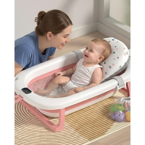 BAÑERA TINA BEBE PLEGABLE PLEGABLE CON TERMOMETRO Y COJÍN ROSA