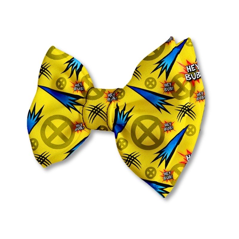 Corbatín para perros inspirado en un luchador de cómics. estilo audaz en amarillo y azul, con ajuste cómodo y seguro para cualquier ocasión.