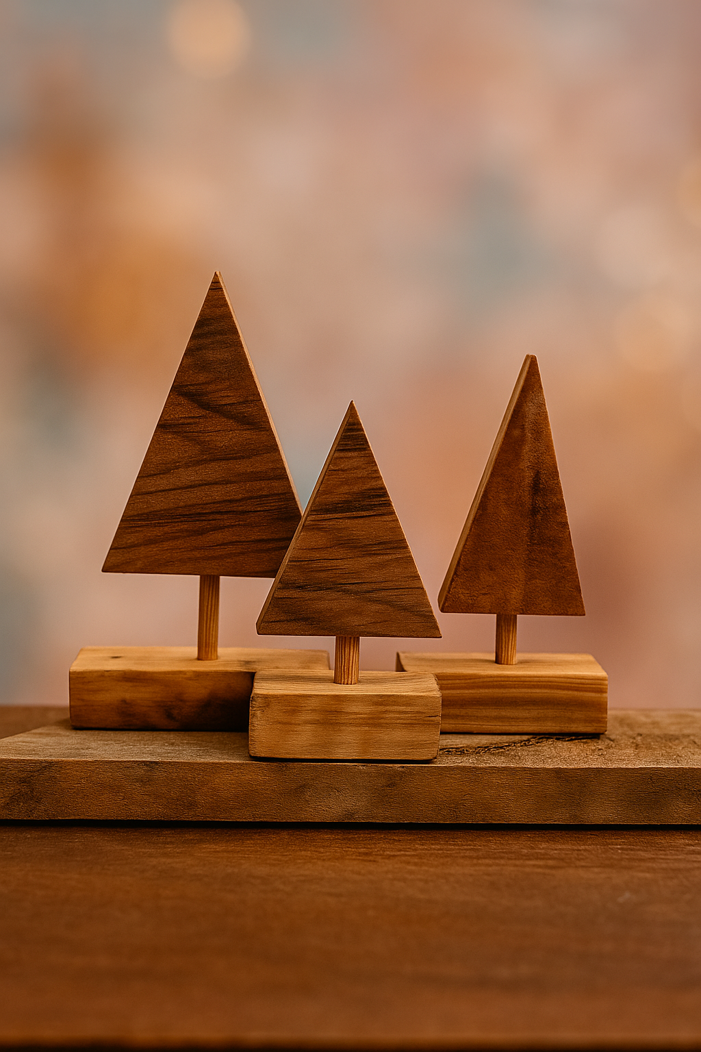 Árboles decorativos hechos a mano con madera reutilizada, de diseño minimalista y cálido, ideales para dar un toque natural y sustentable a la navidad. hechos en chile por circuito verde.