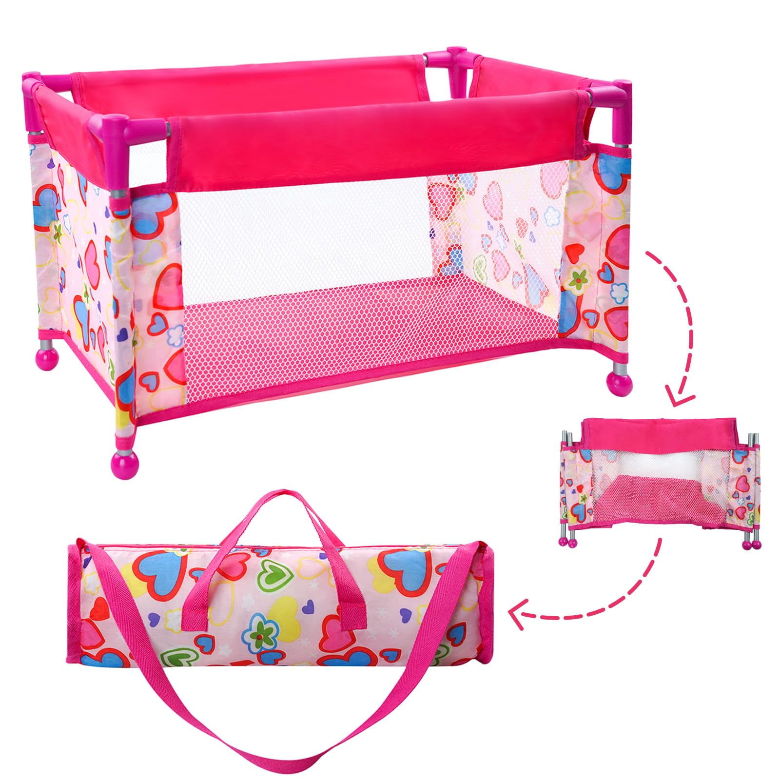 Fabricada con materiales de alta calidad, nuestra cuna portátil para muñecas es muy resistente y duradera, lo que garantiza un juego seguro para los más pequeños. el diseño plegable permite utilizarla en cualquier lugar. ¡es hora de meter tus muñecas favoritas en esta cama con corralitos para un sueño reparador y placentero! para tus pequeños, ya que fomenta el juego de simulación y la diversión imaginativa. a partir de 3 años. información del producto: --tamaño del producto: 52 x 31 x 31 cm (20,5 x 12,2 x 12,2 pulgadas), tamaño plegado: 35 x 11 cm x 11 cm (13,7 x 4,3 x 4,3 pulgadas). --color: rosa. --ámbito de aplicación: adecuado para muñecas de menos de 22 pulgadas. --edad aplicable: niños y niñas mayores de 3 años. --estilo: bonito, lujoso. - ¡la tela es extraíble y es 100% lavable a máquina! recibirás: 1 cuna para muñecas (muñeca no incluida) y 1 bolsa de almacenamiento. [dimensiones del producto]: tamaño expandido: 52 x 31 x 31 cm (20,5 x 12,2 x 12,2 pulgadas), tamaño doblado: 35 x 11 cm x 11 cm (13,7 x 4,3 x 4,3 pulgadas), ideal para muñecas de hasta 21 pulgadas. - [plegable y fácil de instalar]: se pliega perfectamente y viene con una bolsa de almacenamiento con cierre, perfecta para jugar mientras viaja. fácil de montar y no requiere herramientas, por lo que tu pequeño puede poner la muñeca renacida a dormir una siesta en un abrir y cerrar de ojos. - [buen material]: hecho de material abs respetuoso con el medio ambiente, la base y el marco son de metal, lo que proporciona una resistencia y un uso duraderos, lo que garantiza un juego seguro para los más pequeños. - [gran regalo para niños]: el corralito portátil con forma de muñeca auténtica es un accesorio precioso para todos los amantes de las muñecas, y los accesorios de cama para muñecas son un gran regalo para cualquier ocasión, recomendado a partir de los 3 años. ¡promueve el imaginativo juego de simulación! (muñeca no incluida). - [diseño llamativo]: esta muñeca renacida pack n play viene en un color rosa brillante apto para niños con un bonito gráfico de corazón, por lo que es el regalo perfecto para tu princesita. el juego de accesorios para muñecas hace que sea un complemento divertido. - [desarrolla la imaginación de los niños]: bueno para desarrollar la imaginación y la creatividad de los niños, deja que los niños comiencen a disfrazarse. [qué obtienes:] 1 cama rosa para muñecas, 1 bolsa de almacenamiento.