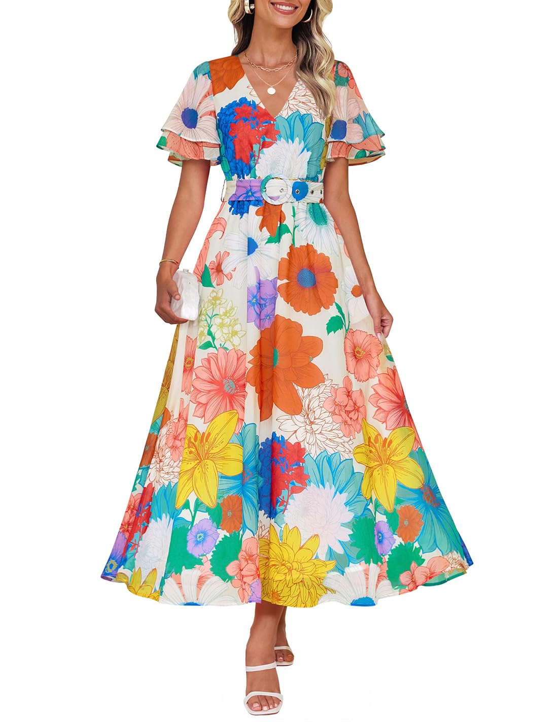 Zesica vestido midi de verano floral con cuello en v para mujer, bohemio, manga corta, cintura alta, vaporoso, playa, vacaciones, con cinturón, naranjaamarillo - s = ee.uu. 4-6, m = ee.uu. 8-10, l = ee.uu. 12-14, xl = ee.uu. 16-18, por favor, comprueba la tabla de tallas cuidadosamente. consejos: es normal que el producto real sea ligeramente más claro en color debido a problemas de estampado floral - este vestido de vacaciones cuenta con mangas cortas, cuello en v, estampado floral atrevido, cintura alta elástica, sin cremallera, longitud midi con un gran dobladillo oscilante, dos bolsillos laterales y un cinturón extraíble. la tela es suave, transpirable, ligera pero no elástica, cómoda de llevar - hay un cinturón desmontable, se puede llevar con el vestido para una ocasión semiformal o quitarlo en la vida casual, las mangas son de diseño de volantes de doble capa, te hace lucir más única y elegante. todos los colores están forrados - muy adecuado para uso casual, diario, ocio, vacaciones, viajes, baby shower, cumpleaños, citas, playa, fiesta, reunión familiar, fotografía, invitada de boda, graduación, al aire libre, etc. puedes combinar con tu collar, aretes, sombrero, tacones, cuñas y sandalias para un aspecto relajado - cuidado de lavado: se recomienda lavar a máquina con bolsa de lavandería, lavar a mano en agua fría, no secar en secadora, no usar blanqueador, colgar o secar al aire