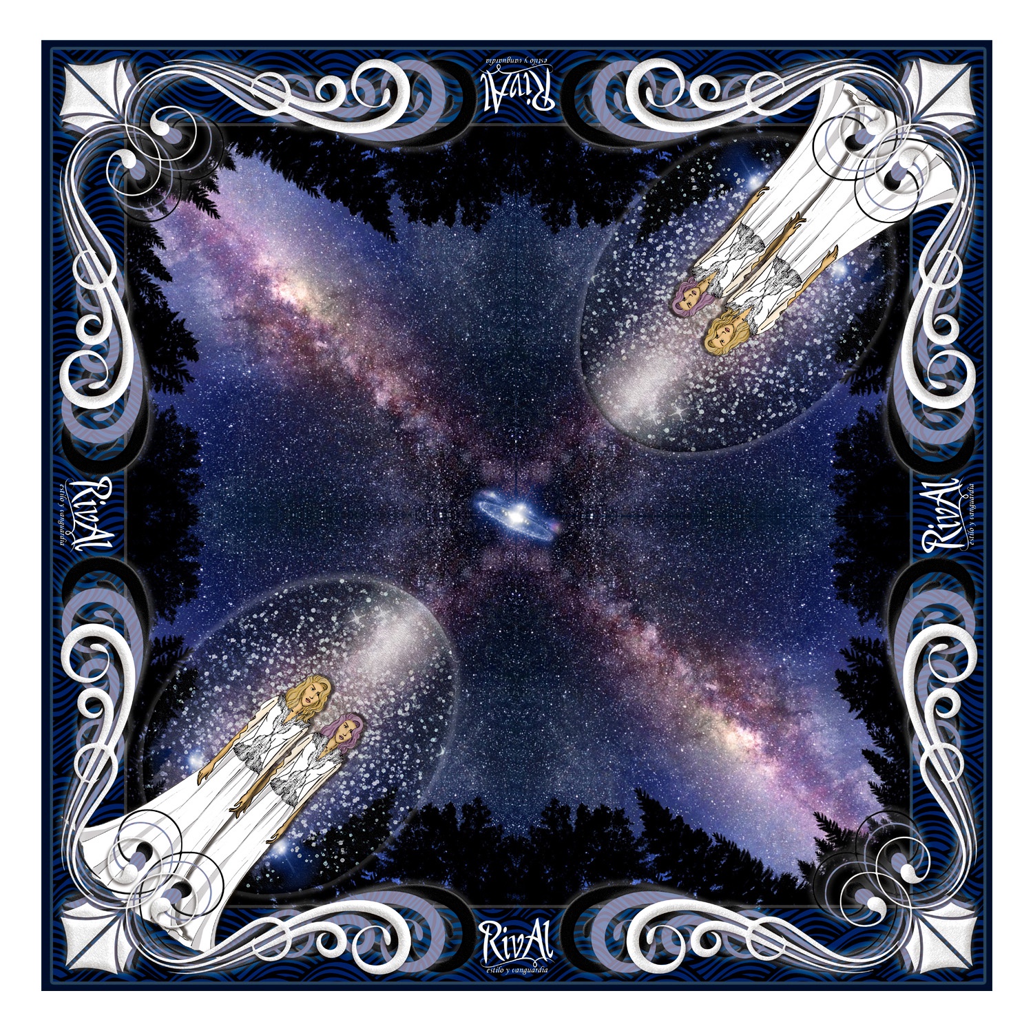 Pañuelo estampado semi satinado estilo nocturno , ilustración pleyadianos en bosque, portal, logotipo rival en diseño borde.