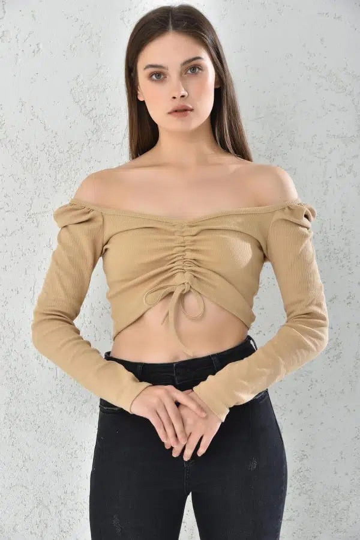 Home Fashion - Polera Mujer Crop Con Escote Detras Manga Larga Beige Talla S