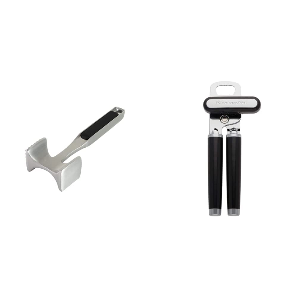 Kitchenaid ablandador de carne + abrelatas/abrebotellas (negro) - el ablandador de carne tiene un lado texturizado para ablandar y un lado liso para golpear y aplanar la carne en chuletas. está hecho de aluminio, mide 11 pulgadas de largo y tiene un agujero para colgar el almacenamiento. - el abrelatas cuenta con una hoja de acero inoxidable y un abridor de botellas integrado en la cabeza. tiene una perilla fácil de girar y asas ergonómicas para mayor comodidad. - tanto el ablandador de carne como el abrelatas se lavan a mano solo con agua tibia y detergente suave. el abrelatas viene con un reemplazo sin complicaciones de 1 año.