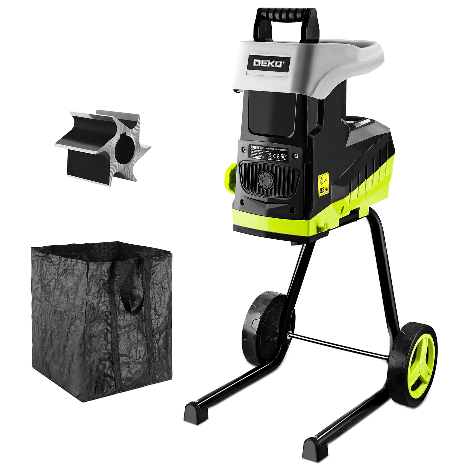 Trituradora eléctrica dekopro de 2800 w y 15 amperios, diseñada para cortar ramas y desechos de jardín de hasta 1.77" de grosor con eficiencia y seguridad.