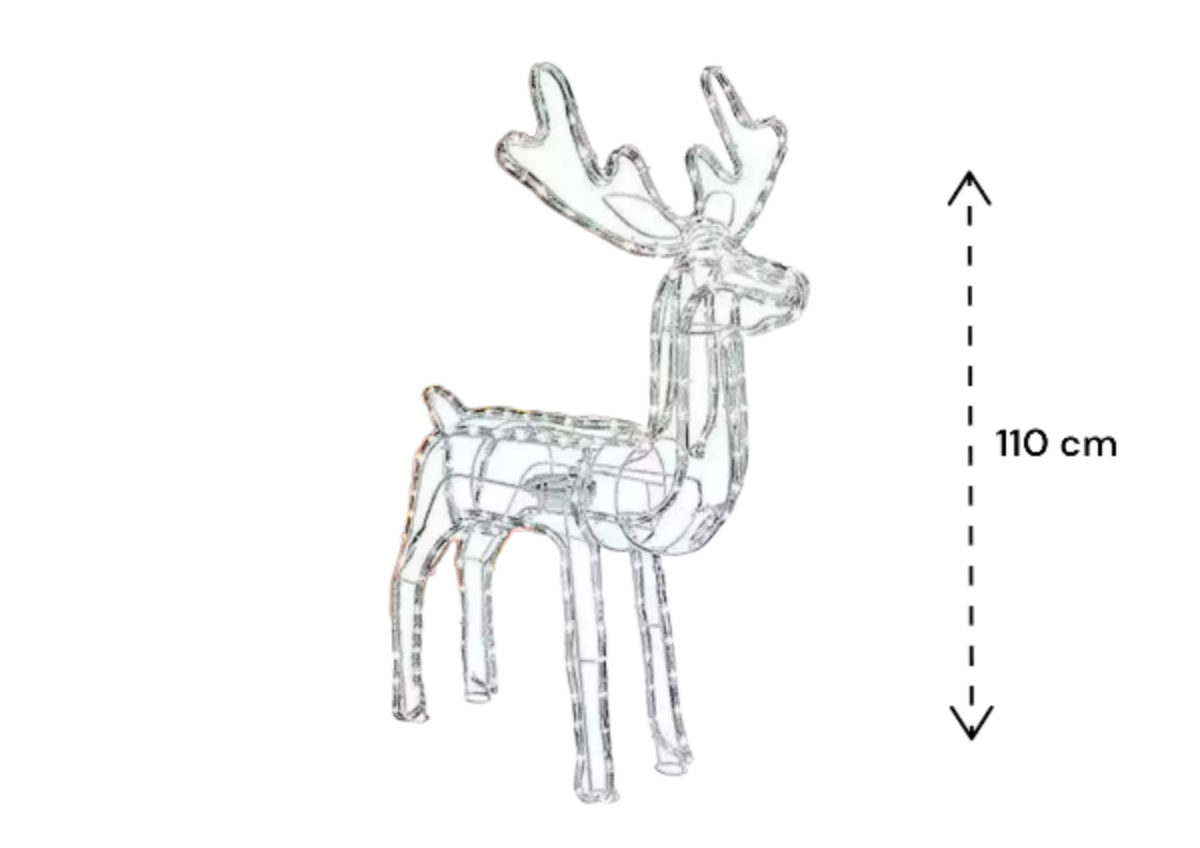 Este imponente reno navideño de 110 cm de altura, iluminado con luces led de tonalidad cálida, es el adorno perfecto para crear una atmósfera acogedora y festiva en tu hogar. su elegante diseño, acompañado de una suave iluminación cálida, resalta su figura esculpida y agrega un toque de magia navideña a cualquier espacio. ideal para decorar la entrada, el salón o junto al árbol de navidad, este reno se convierte en una pieza central que atrae todas las miradas y aporta un ambiente de calidez y alegría. con su luz cálida y su silueta encantadora, será el protagonista perfecto de tus celebraciones navideñas. ¡añade un toque de elegancia y luz a tu decoración con este reno navideño!