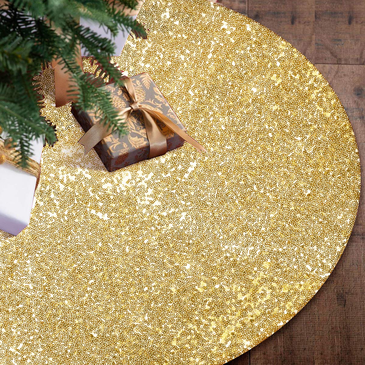 Yuboo falda dorada para árbol de navidad, cuello de árbol de navidad con lentejuelas de 48 pulgadas, doble capa para navidad y adornos dorados - material: tela cubierta con lentejuelas redondas brillantes de 0.118 in. la luz se refleja bien en las lentejuelas, añade elegancia encantadora a cualquier ocasión alegre. - forro de doble capa, poliéster y lentejuelas y forro de algodón, grueso y duradero. la falda de árbol de lentejuelas centelleante ilumina tu habitación. - tres velcro en la abertura para asegurar la falda del árbol alrededor y en su lugar como un vestido debajo del árbol de navidad. - perfecto para presentaciones con catering, bodas, despedidas de soltera y baby showers, cumpleaños, bufés de dulces clásicos, mesas de postres y más. decoración de navidad, decoraciones de navidad, falda de árbol de navidad. - tamaño grande de 48 pulgadas. perfecto para árboles de cualquier tamaño, desde árboles pequeños de 5 pies hasta árboles grandes de 7 pies, desde árboles de navidad artificiales decorados tradicionalmente hasta caprichosos.