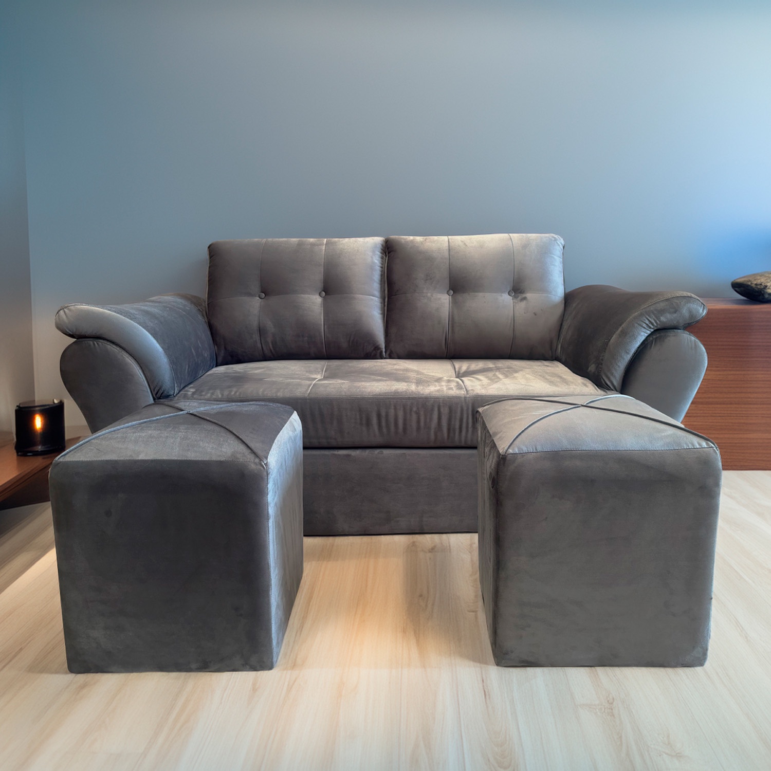 Sofá venecia + 2 puff felpa gris