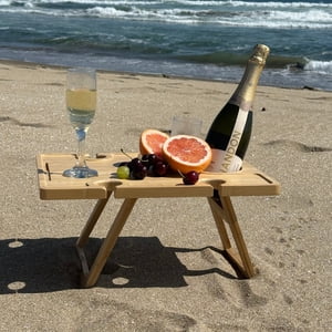 Mesa picnic rectangular plegable de bambú resistente, con orificios para 1 botella y 4 copas. ideal para aperitivos y picnics al aire libre.